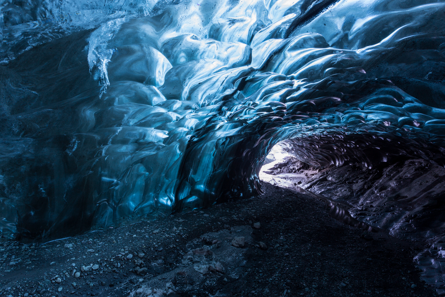 One of the most distinctive features of Iceland’s ice caves is undoubtedly their beautiful blue color. Glacial ice appears blue, and the main factor contributing to this is its density, which is much greater than ordinary ice, such as that taken from a freezer. This ice is also significantly thicker. This is the result of a process standing thousands of years, in which snowflakes that first fell on the frozen ground and then on the ice, snowflakes are compressed by the next snowfall, which fell and then refreezes, turning into ice. When under the influence of masses of ice and snow striking compression, air bubbles are stuffed to the surface, whereby the ice becomes thicker and thicker. When a block of ice is too dense to contain air, light can penetrate deeper. And the deeper light penetrates such ice, the more red color (and other colors) it loses along the way, except blue, giving the ice such incredible color. That’s why glacial ice in Iceland has this magical shade of blue, creating a mesmerizing atmosphere inside caves.